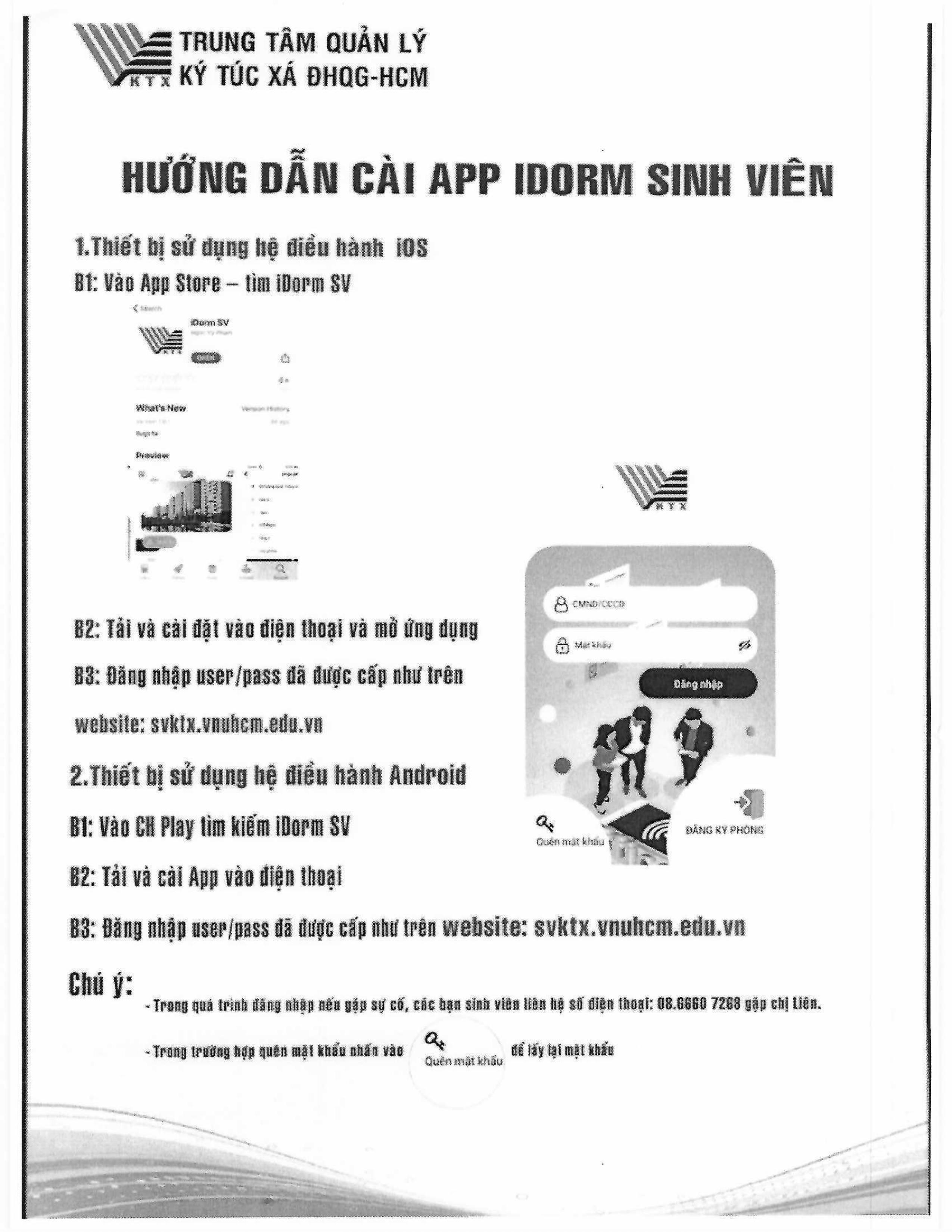 - Sinh viên truy cập link: http://svktx.vnuhcm.edu.vn hoặc App iDorm SV để đăng ký ở Ký túc xá (xem hướng dẫn cài đặt app tại phụ lục I).
