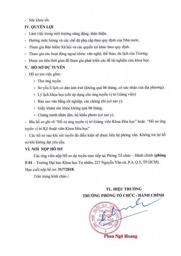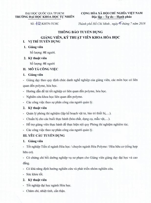 Bài viết Thông báo việc làm và thực tập 06 Tháng 7 2018 Lượt xem: 13831 Thông báo tuyển dụng giảng viên, kỹ thuật viên Khoa Hóa học File đính kèm Trước Trang sau