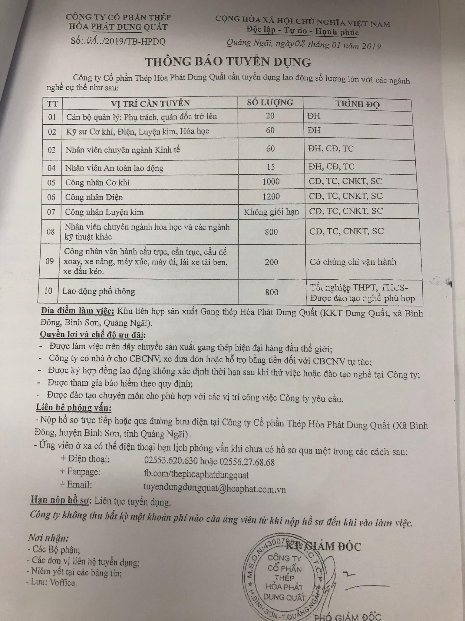 Bài viết Thông báo việc làm và thực tập 18 Tháng 1 2019 Lượt xem: 12355 Thông tin tuyển dụng của công ty Cổ phần thép Hòa Phát Dung Quất Trước Trang sau