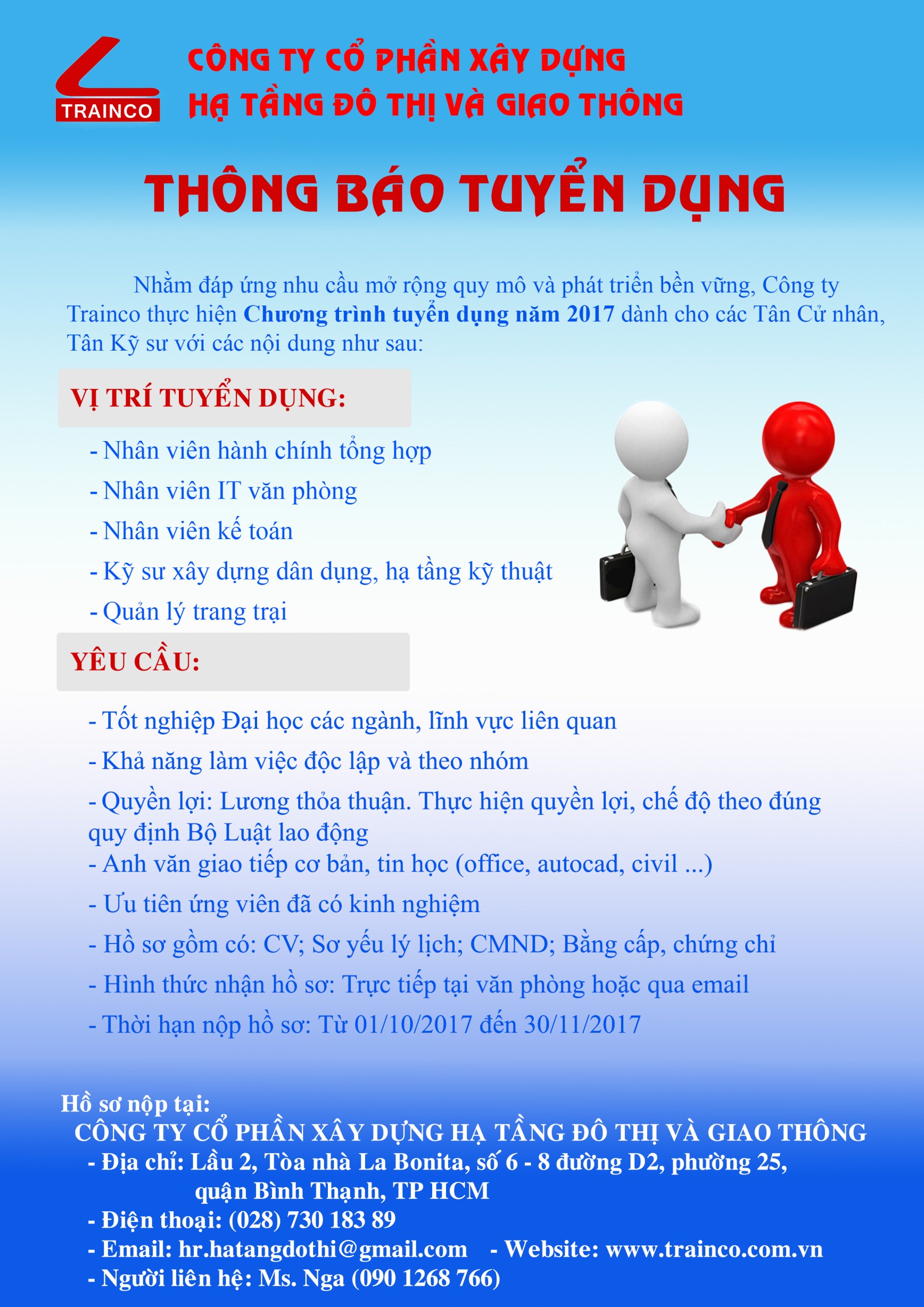 Bài viết Thông báo việc làm và thực tập 05 Tháng 10 2017 Lượt xem: 31469 Thông báo tuyển dụng của Công ty cổ phần xây dựng hạ tầng đô thị và giao thông Trước