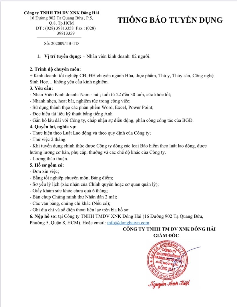 Phòng Quan hệ Đối ngoại có nhận được Thông báo tuyển dụng từ Công ty TNHH TM DV XNK Đông Hải, như sau: